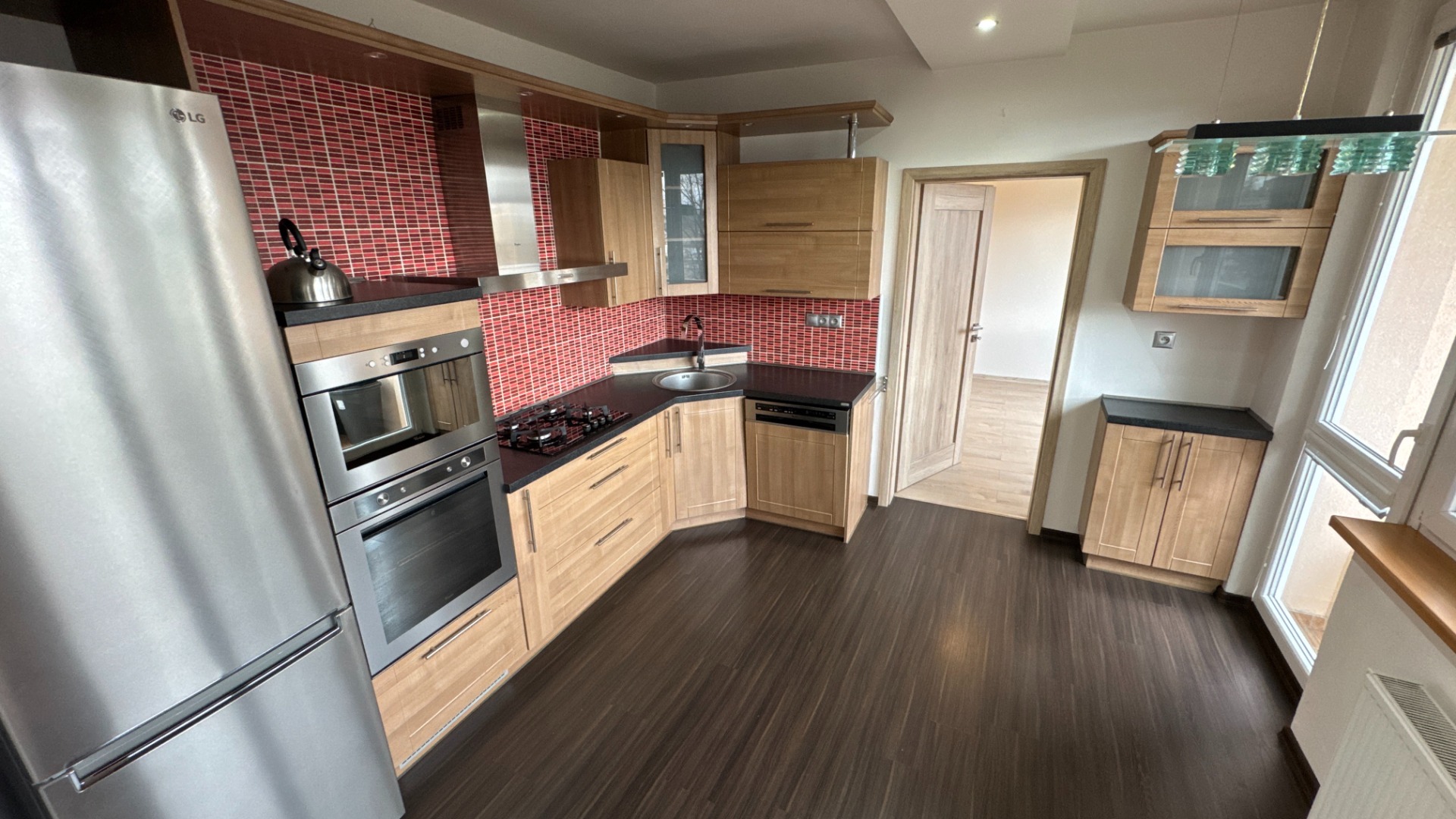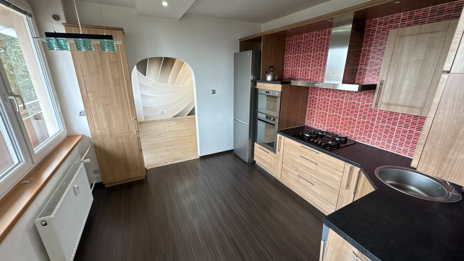 Kuchyňa je vybavená elegantnou linkou v tvare "L" so zabudovanými spotrebičmi (plynová varná doska, elektrická teplovzdušná rúra, mikrovlnná rúra, umývačka riadu, nerezový digestor a nerezové drezové umývadlo s pákovou batériou).